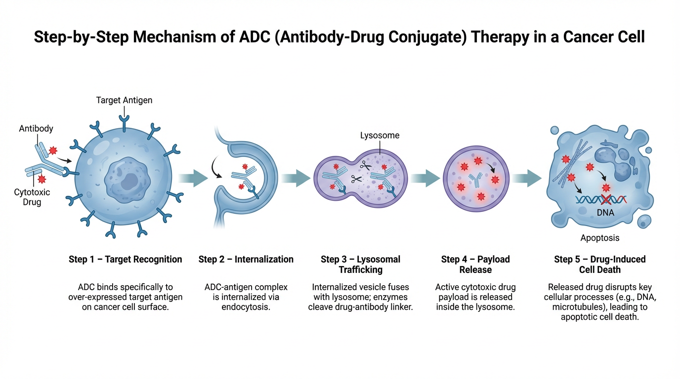 An ADC consists of three main components: a monoclonal antibody, a cytotoxic payload, and a linker that connects them. The antibody is engineered to recognize a specific antigen that is highly expressed on cancer cells. This targeting mechanism allows the ADC to bind selectively to tumor cells, acting like a guided delivery system. Once bound, the ADC is internalized into the cancer cell through receptor-mediated endocytosis. Inside the cell, the linker is broken down, releasing the cytotoxic drug. These payloads are extremely potent and work by disrupting critical cellular functions such as DNA replication or microtubule formation, ultimately causing cell death.